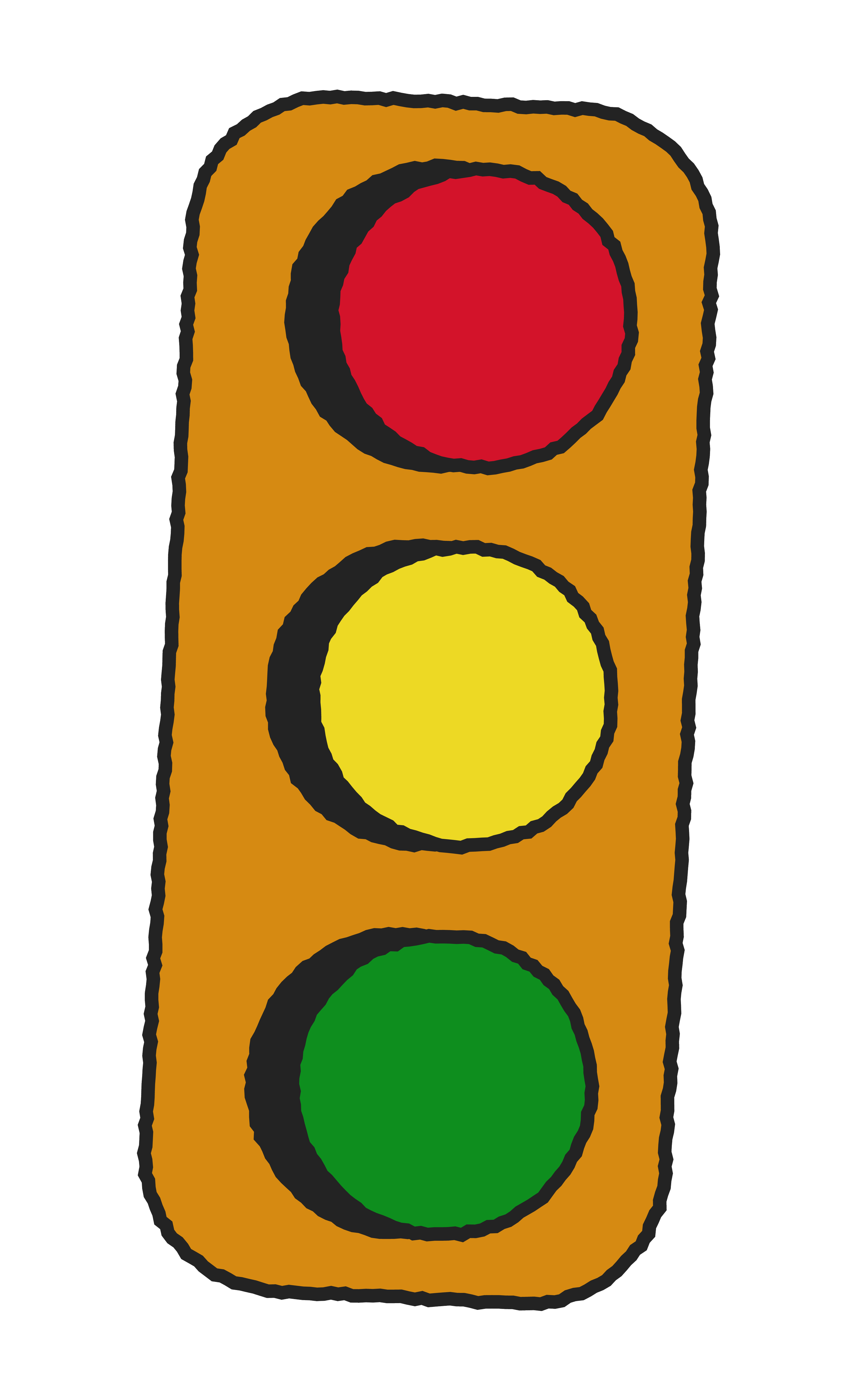 Drawing of a traffic light with red, yellow, and green lights from top to bottom.