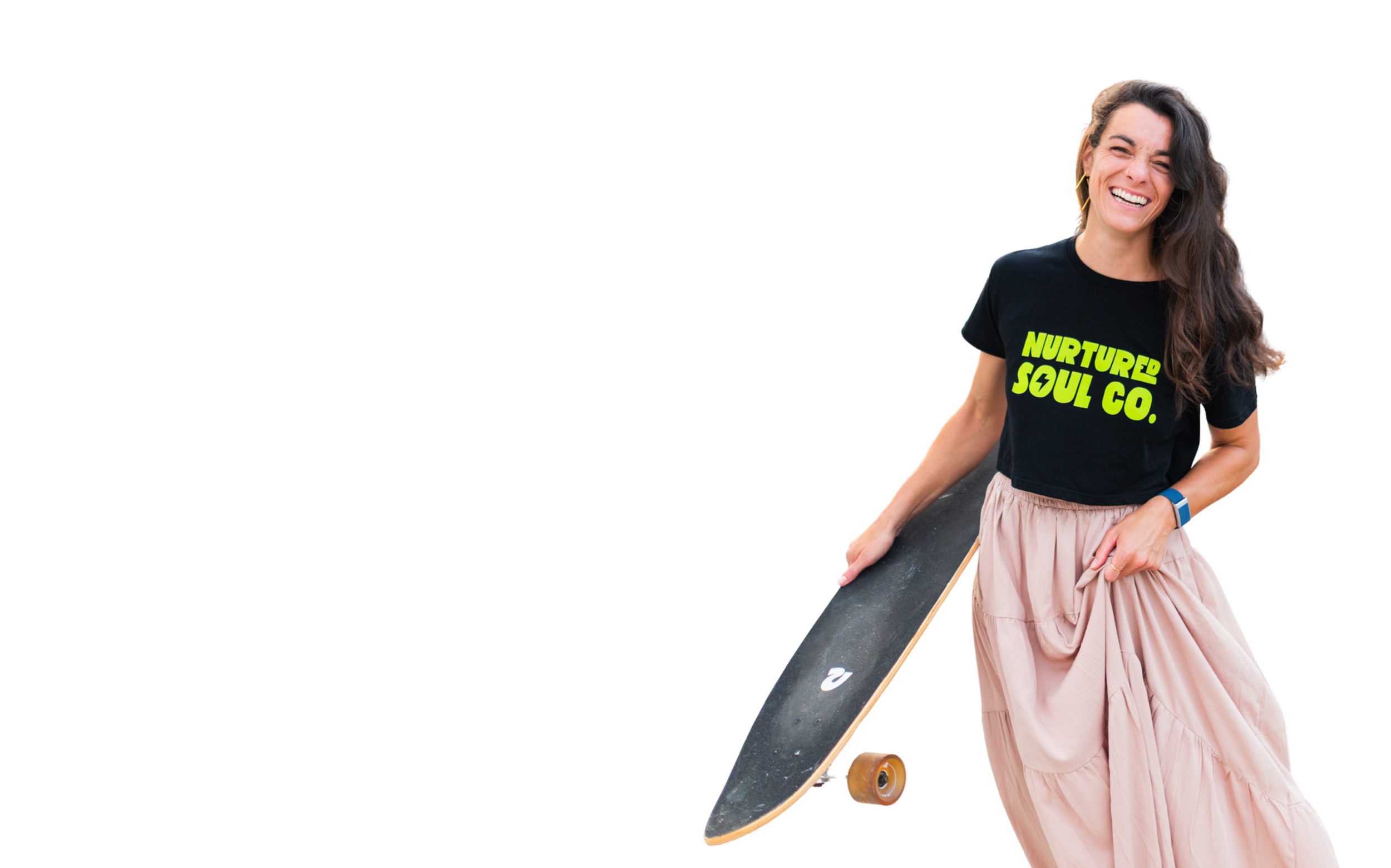 A woman smiling and holding a skateboard, wearing a black t-shirt with bright green text that reads 'NURTURED SOUL CO.' and a flowing light pink skirt.
