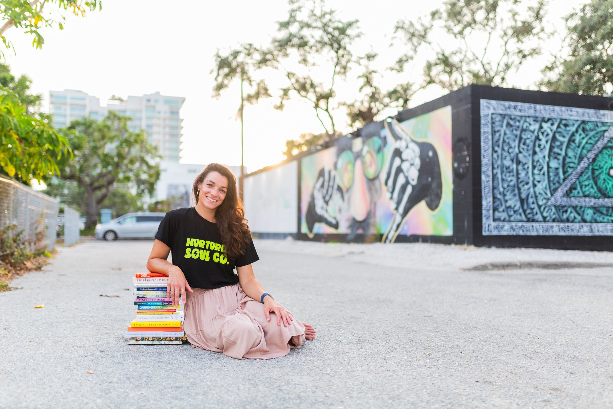 A woman sitting on the ground with a stack of books beside her, smiling, outdoors near a colorful mural.