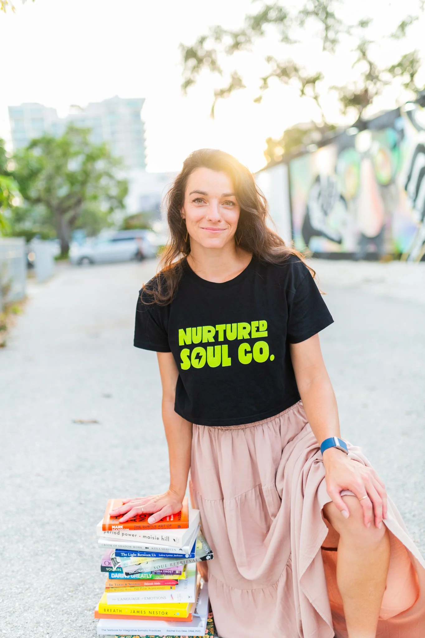 A woman with long curly hair sitting on the ground outdoors near a stack of books, wearing a black t-shirt with neon green text that says 'NURTURE SOUL CO.' and a beige skirt, with graffiti art and trees in the background, illuminated by sunlight.